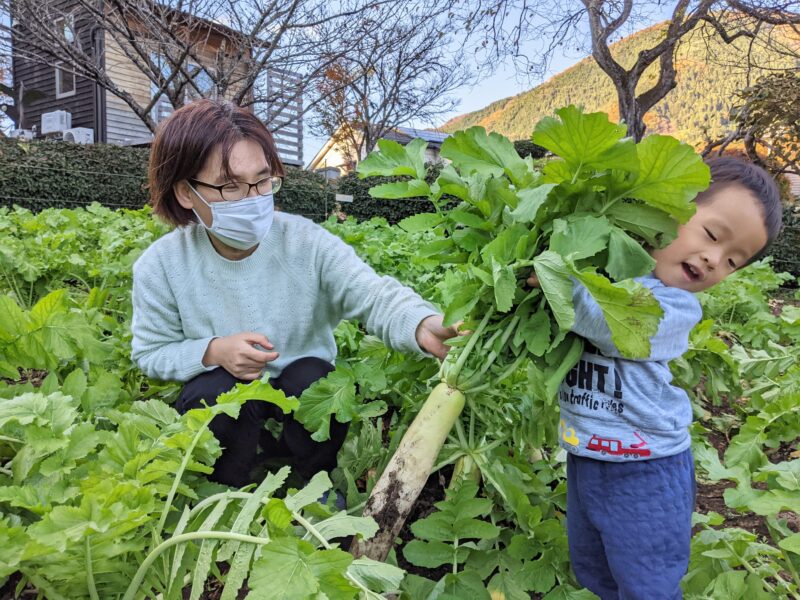 内容は、野菜すくい、もろこしかりんとう作り、木のキーホルダーづくり、大根の収穫体験、古民家ホテルツアーなど。