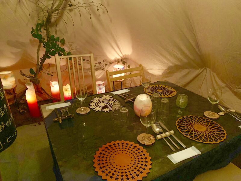 薪ストーブがあるテント内は、ソファー、キャンドル、流木などがしつらえられた空間に。